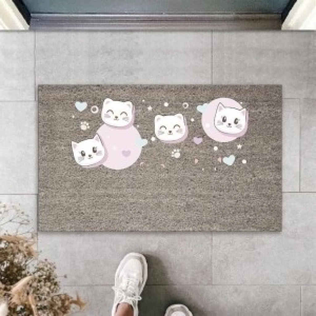 Dijital Baskı Gri Kalpli Pembeli Uykucu Kediler Dekoratif Kapı Paspası K-2068