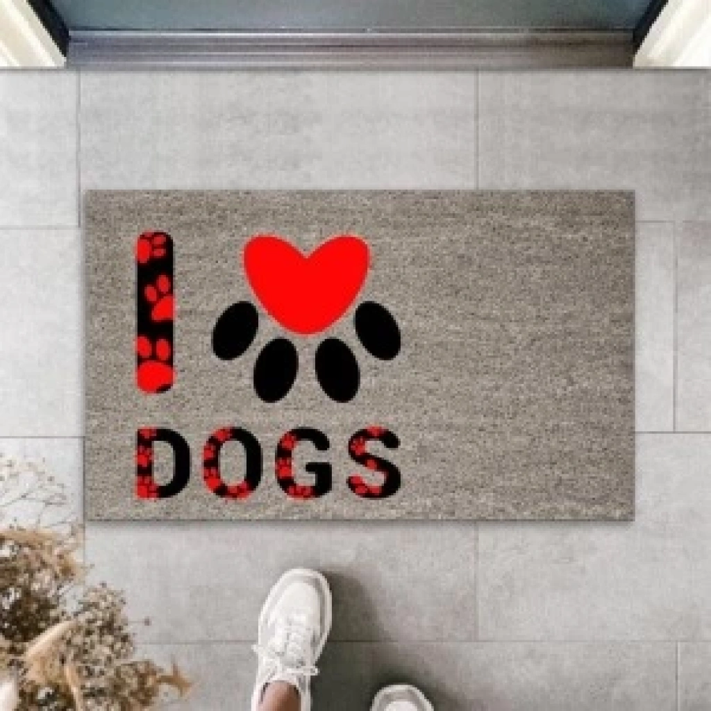 Dijital Baskı Gri Kırmızı Kalpli Patili I Love Dogs Dekoratif Kapı Paspası K-2076