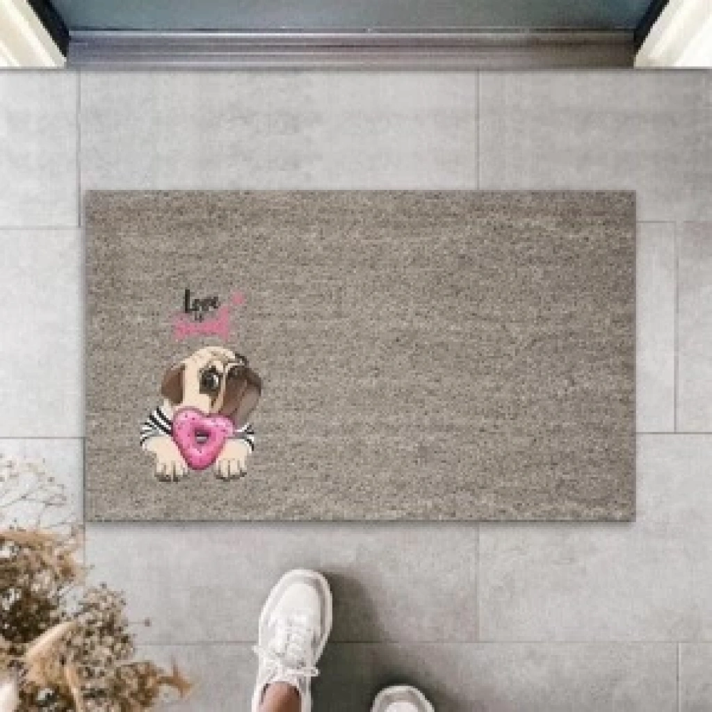 Dijital Baskı Gri Love Sweet Pembe Şekerlemeli Bulldog Köpek Dekoratif Kapı Paspası K-2077