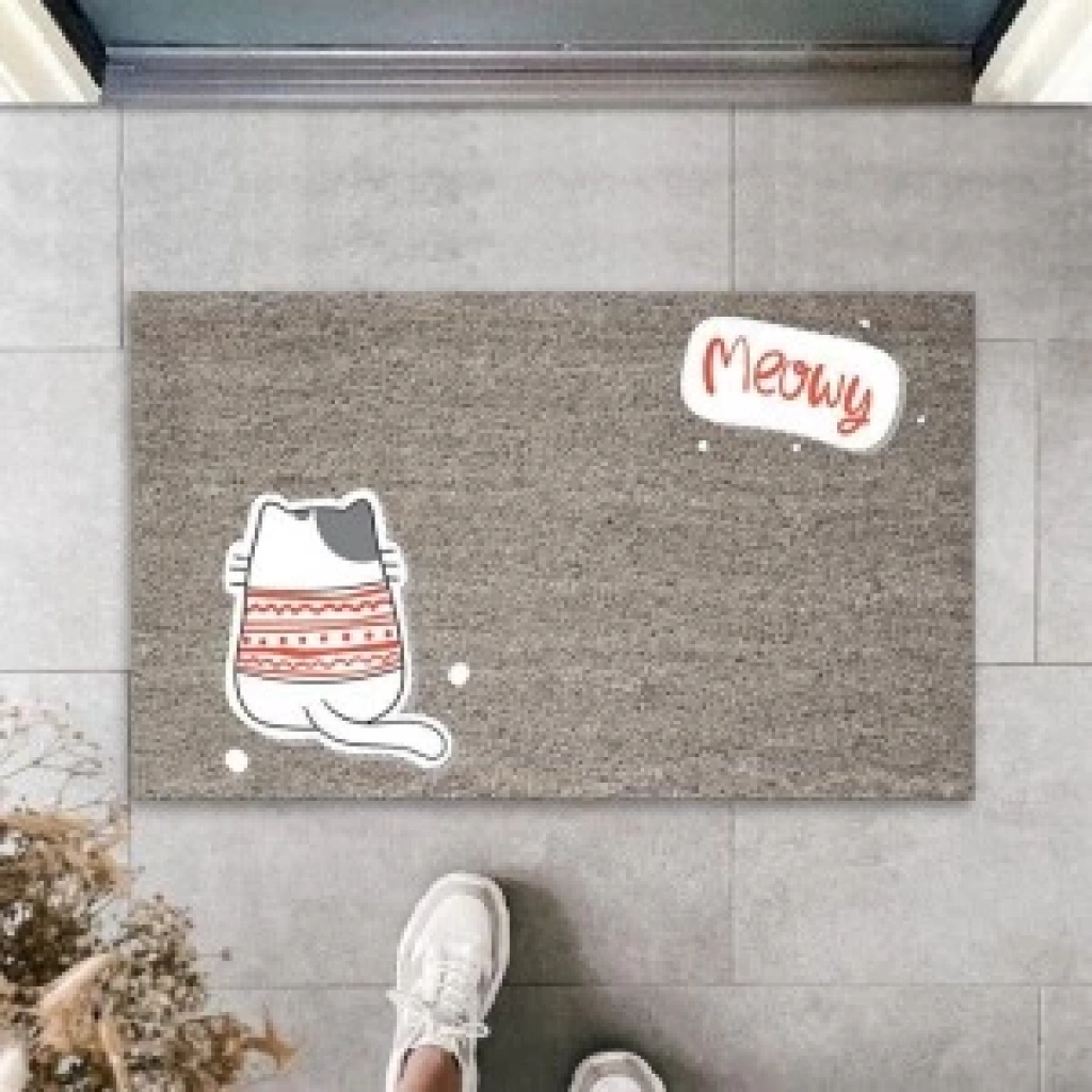 Dijital Baskı Gri Meowy Yazılı Arkasını Dönmüş Kazaklı Kedi Dekoratif Kapı Paspası K-2061