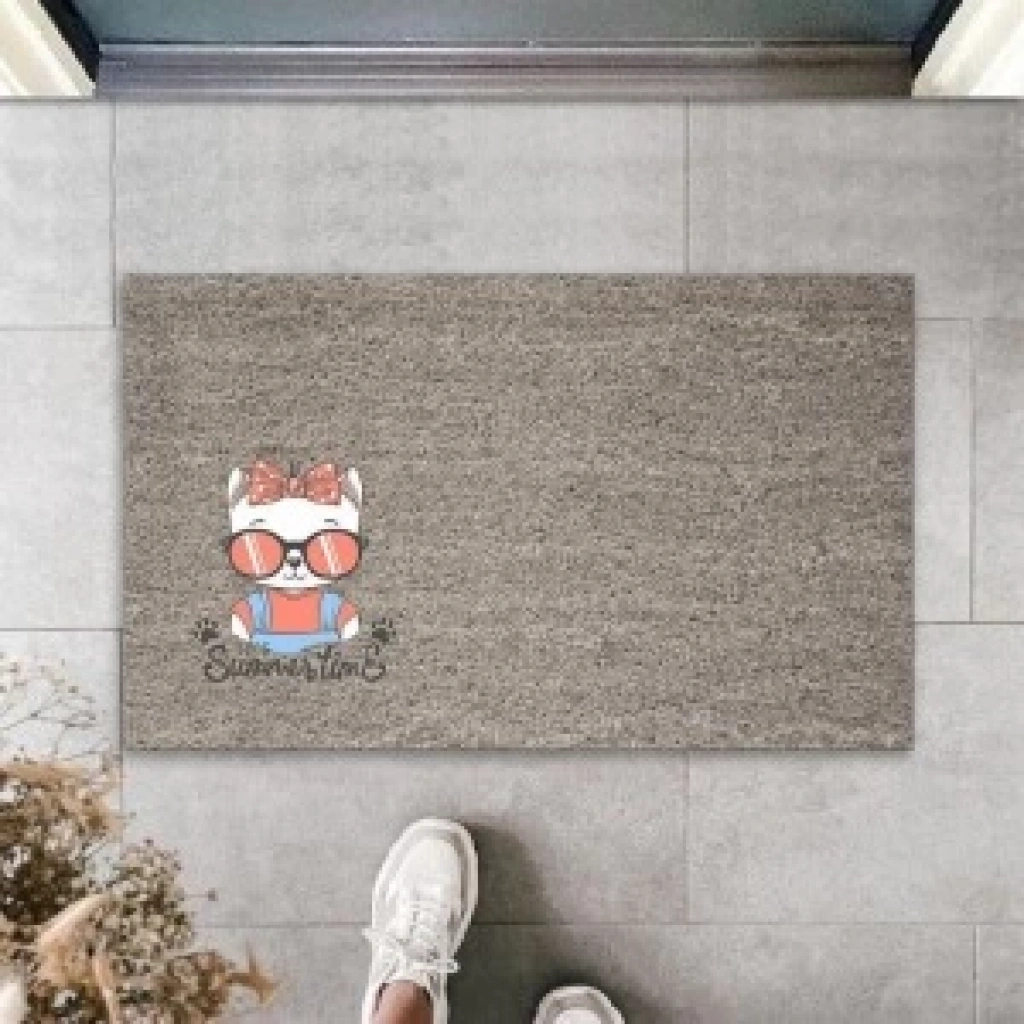 Dijital Baskı Gri Summertime Yazılı Fiyonklu Gözlüklü Beyaz Kedi Dekoratif Kapı Paspası K-2051