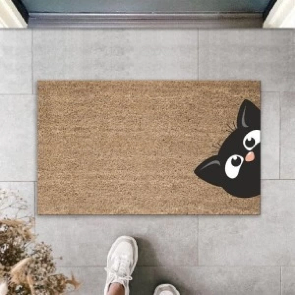 Dijital Baskı Kahverengi Kenardan Bakan Kara Kedi Dekoratif Kapı Paspası K-2018