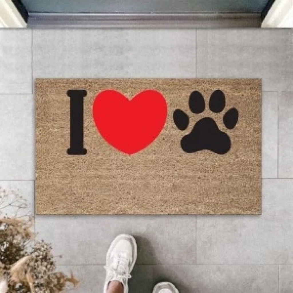 Dijital Baskı Kahverengi Kırmızı Kalpli I Love Pati Dekoratif Kapı Paspası K-2074