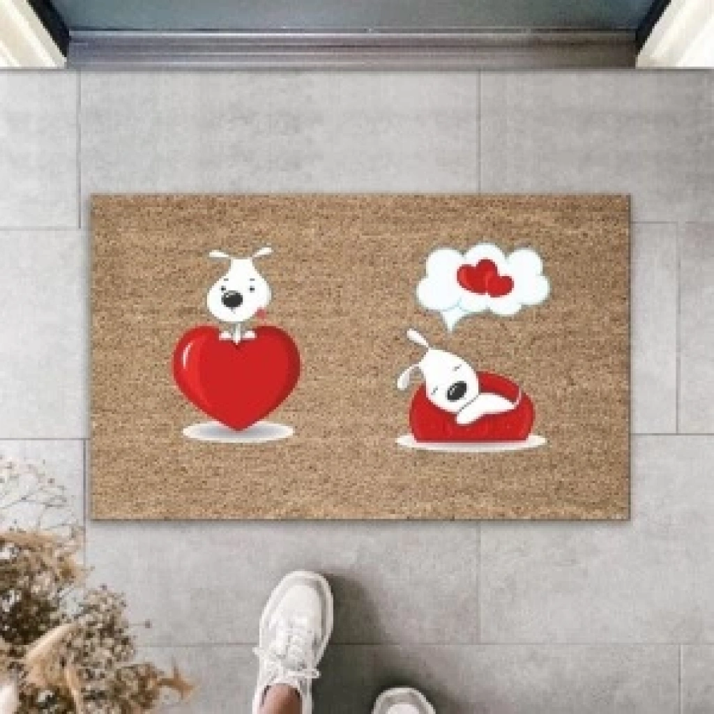 Dijital Baskı Kahverengi Kırmızı Kalpli Rüya Gören Köpekler Dekoratif Kapı Paspası K-2012