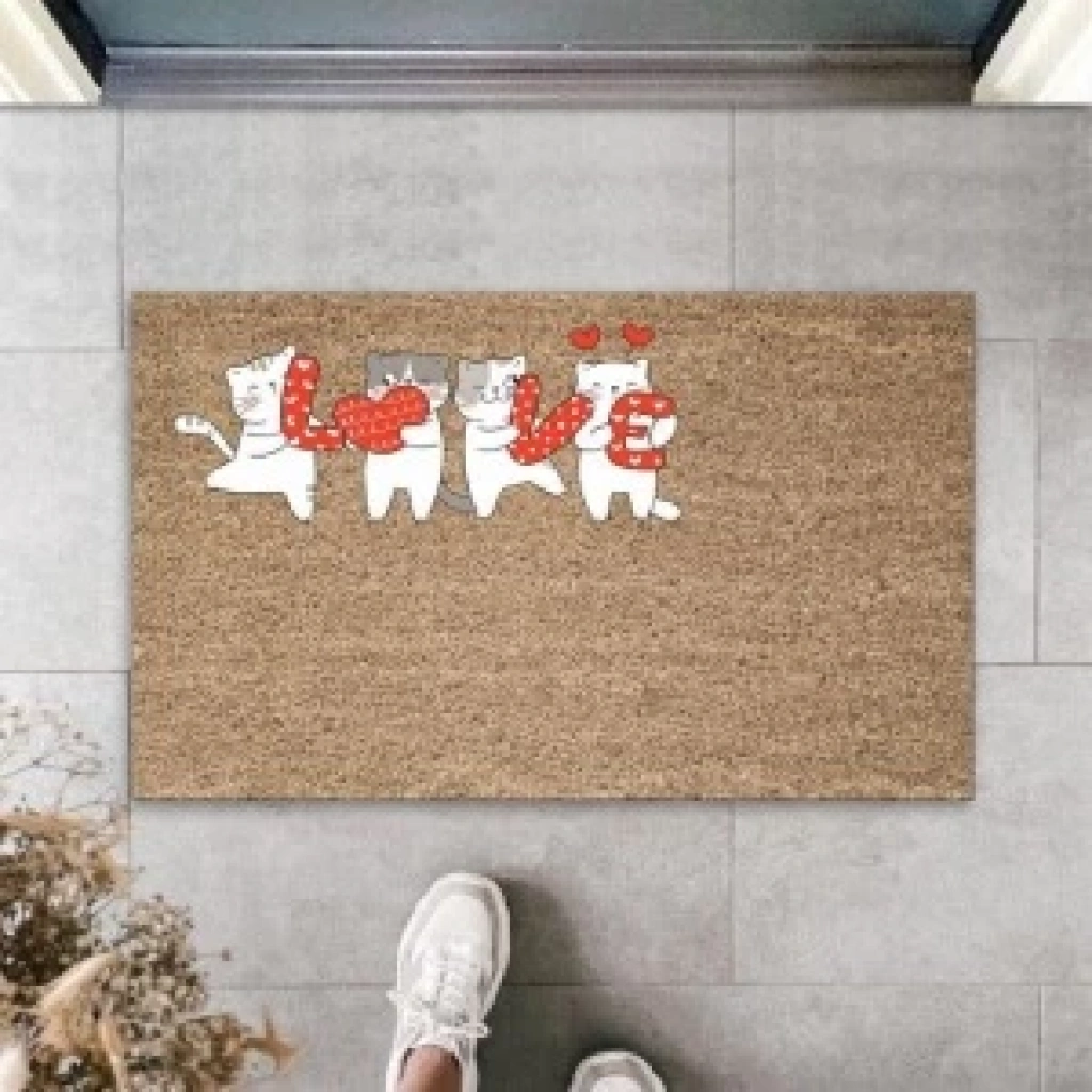 Dijital Baskı Kahverengi Love Harflerini Tutan Beyaz Kediler Dekoratif Kapı Paspası K-2066