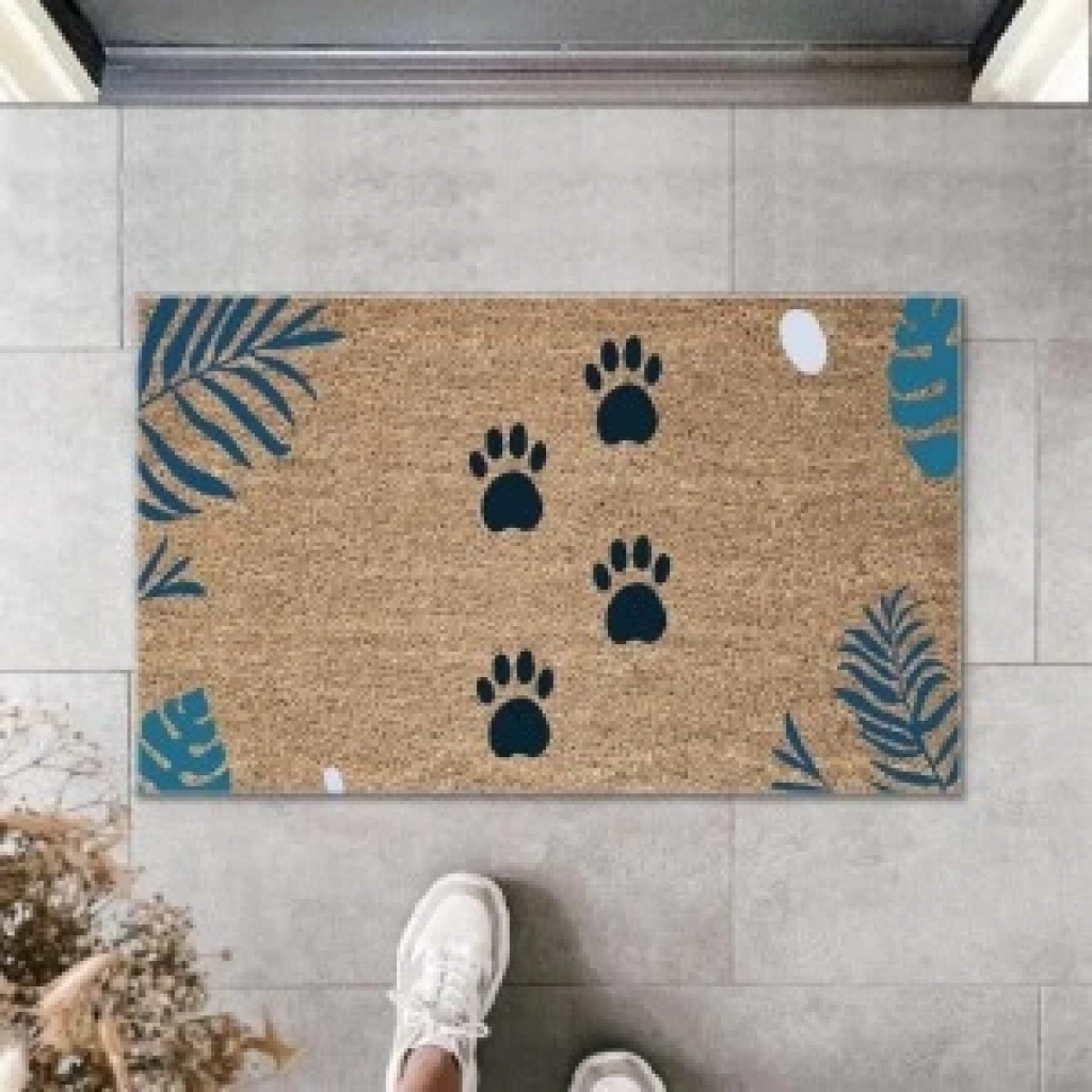 Dijital Baskı Kahverengi Mavi Yapraklı Patili Dekoratif Kapı Paspası K-2008