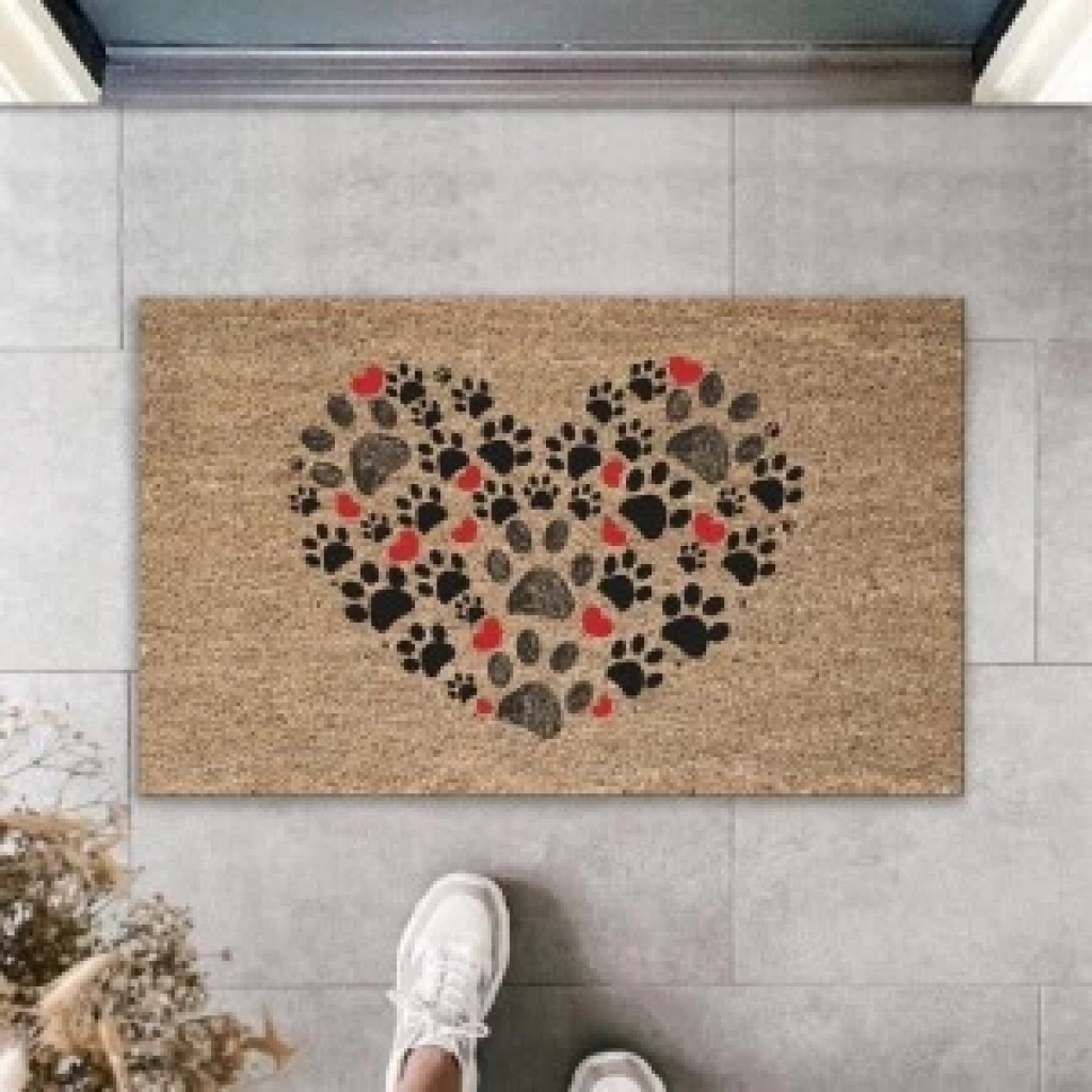Dijital Baskı Kahverengi Patili Kalp Dekoratif Kapı Paspası K-2044