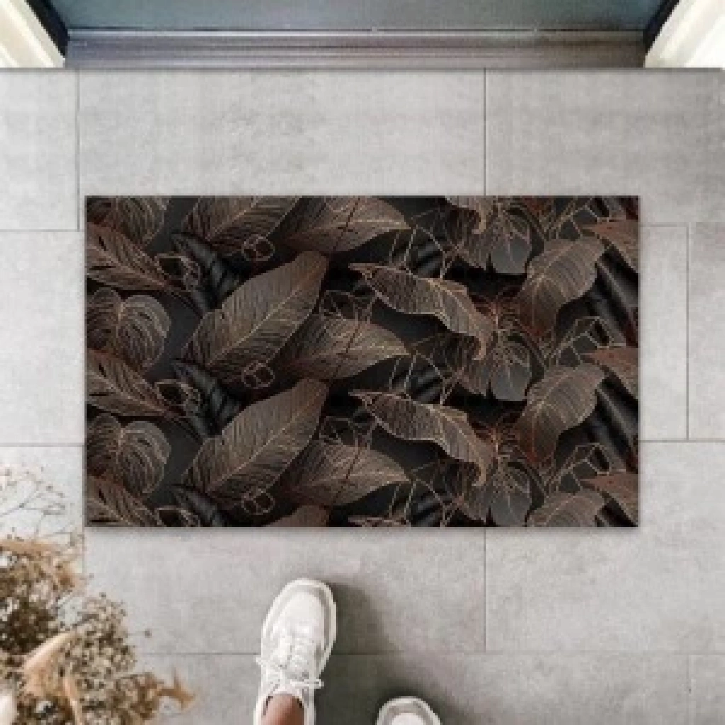 Dijital Büyük Yapraklar Siyah-gold Kapı Paspası Dış Mekan Paspas K-3122