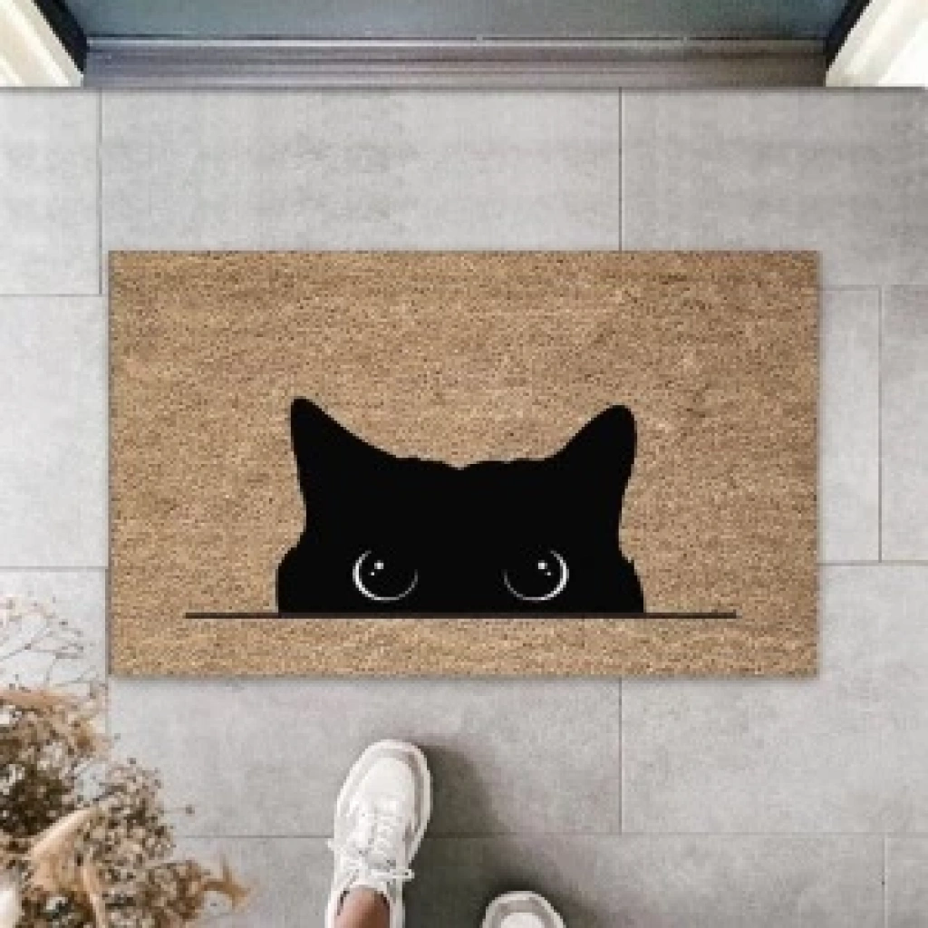 Dijital Kara Kedi Bej Kapı Paspası Dış Mekan Paspas K-3185