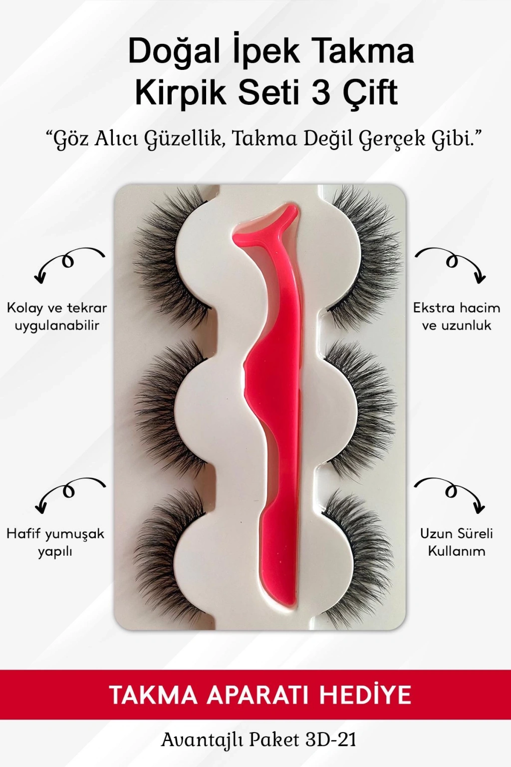 Doğal İpek Takma Kirpik 3 Çift + Kirpik Takma Aparatı 3d-21
