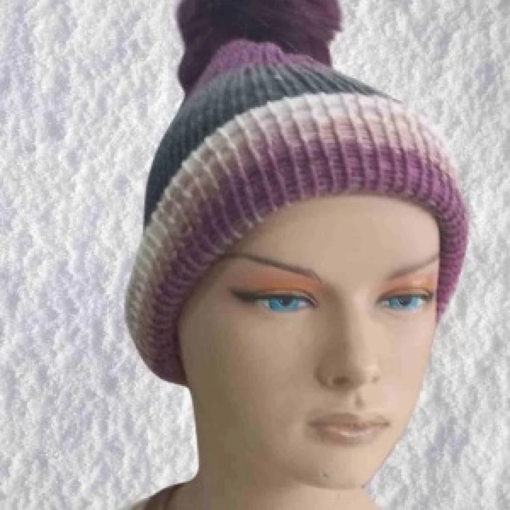 El Örgüsü Doğal Yün Ve Akrilik Karışımlı Sıcacık Kış Beresi Mor Gri Karışık Renk