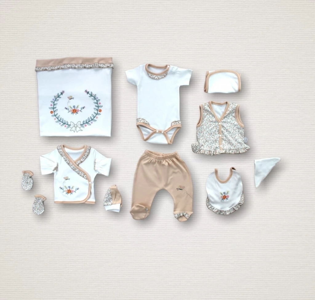 Bahar Çiçekleri Nakışlı %100 Cotton Antibakteriyel 10lu Zıbın Takımı Hastane Çıkışı