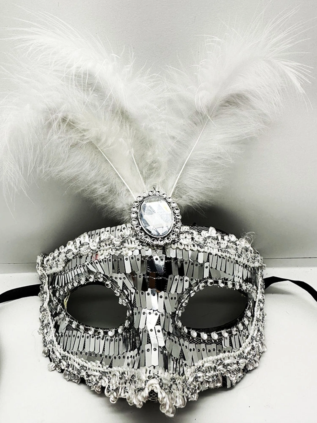 Gümüş Renk Payetli Pullu Tüylü Parti Maskesi Ürün Ölçüsü : 17x20 Cm ( Tüy Dahil ) Kaliteli Plastik Malzemeden Üretilmiştir Maske Üzeri Parlak Payetli Pullarla Kaplıdır İp Aparatı Sayesinde Yüze Göre Uyum Sağlar Ve Yüzden Düşmez