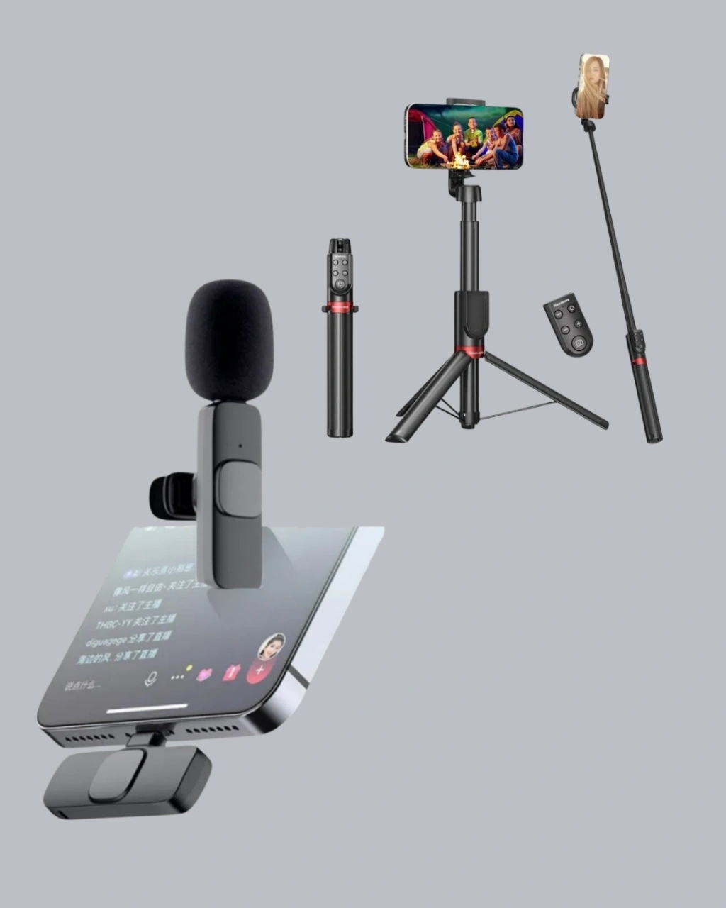 Kablosuz Çift Yaka Mikrofonu ve Tripodlu Selfie Çubuğu İçerik Üretici Seti