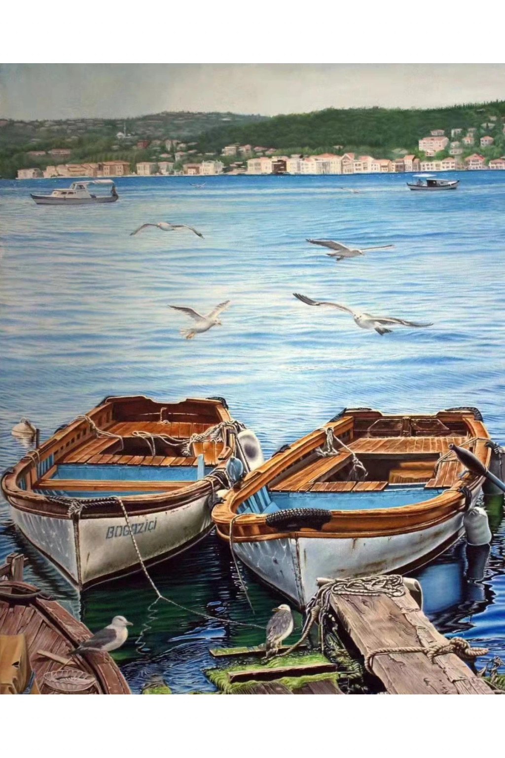 Kanvas Sayılarla Boyama Seti Kasnaklı-çerçeveli Kayıklar Ve Martılar