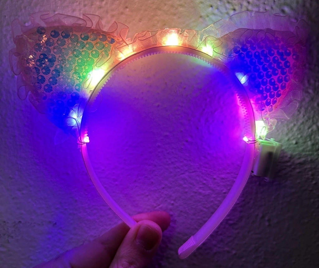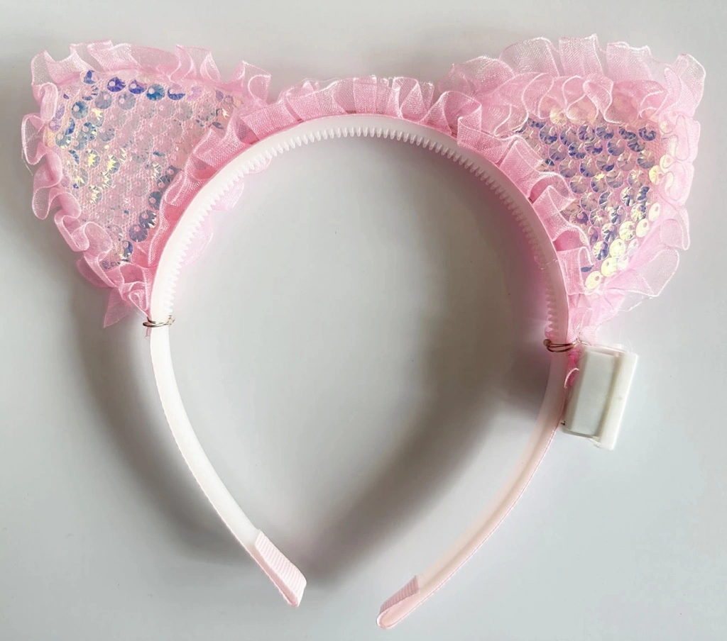 Eğlencenin ve şıklığın bir araya geldiği Kenarları Dantelli Pembe Pullu Payetli Led Işıklı Kedi Kulak Taç ile partilerin yıldızı olun