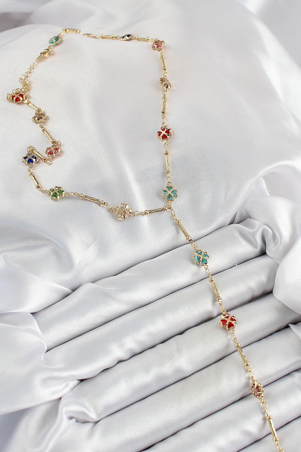 Pirinç Asorti Kalpli Yonca Model Gold Renk Zirkon Taşlı Y Kolye - TJ-BKO10255