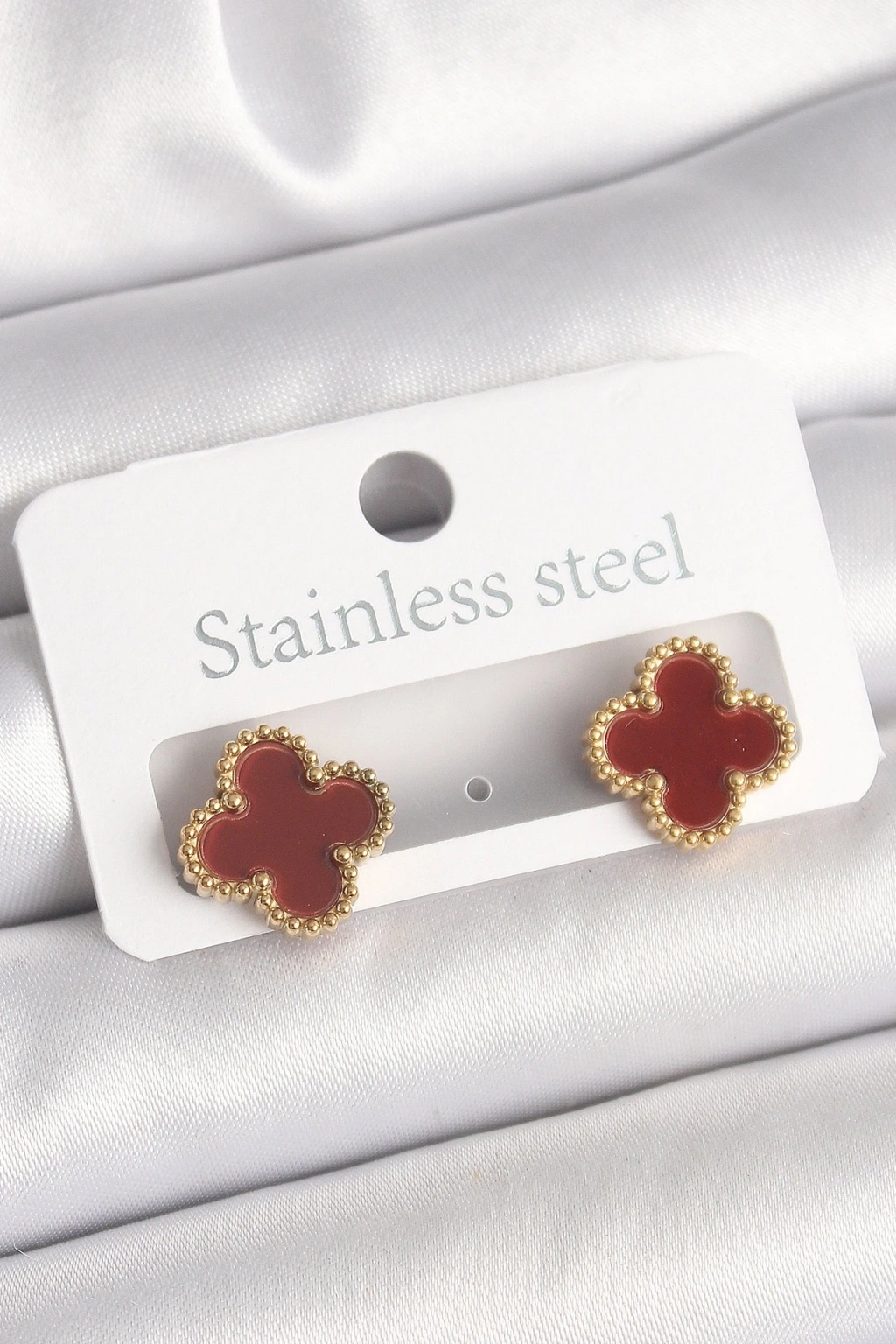 Pirinç Gold Renk Bordo Yonca Model Kadın Küpe