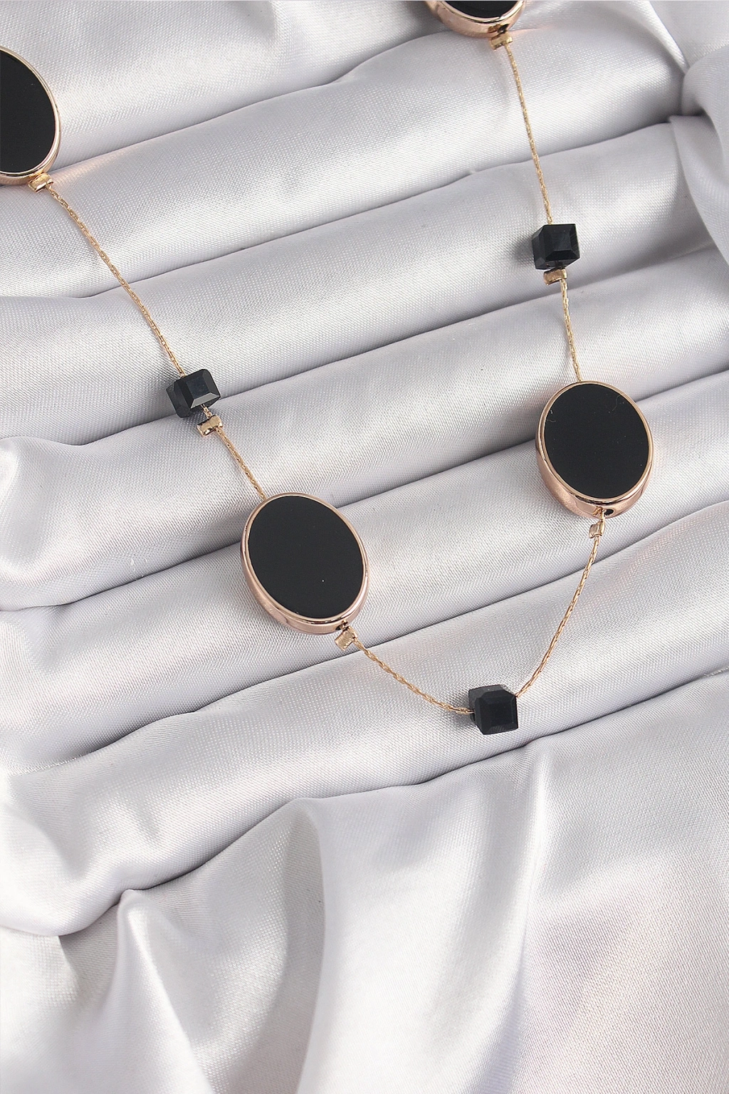 Pirinç Gold Renk Siyah Renk Oval Siyah Küp Detay Kadın Kolye