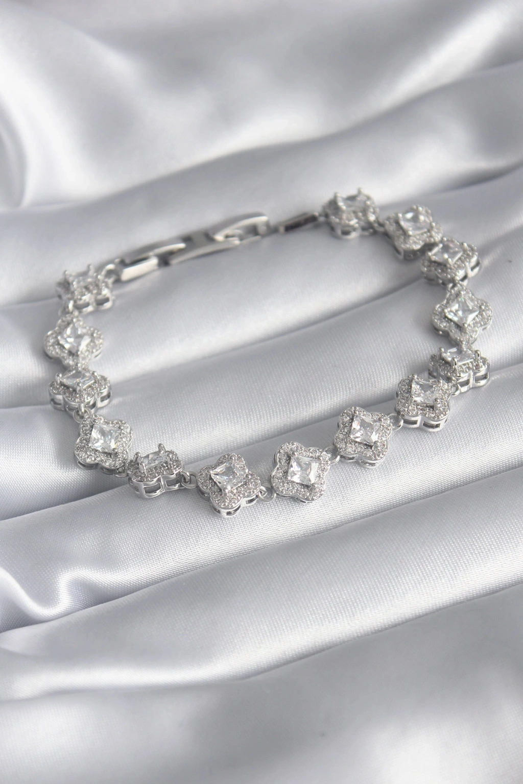 Pirinç Gümüş Renk Zirkon Taşlı Yonca Model VIP Seri Kadın Bileklik - TJ-BB5845