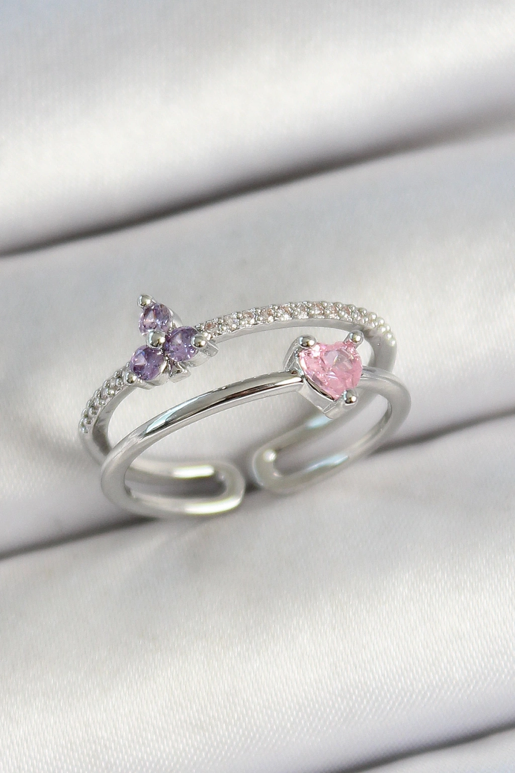 Pirinç Kalp Ve Çiçek Figürlü Zirkon Taşlı Gümüş Renk Ayarlanabilir Kadın Yüzük - TJ-BYK3775