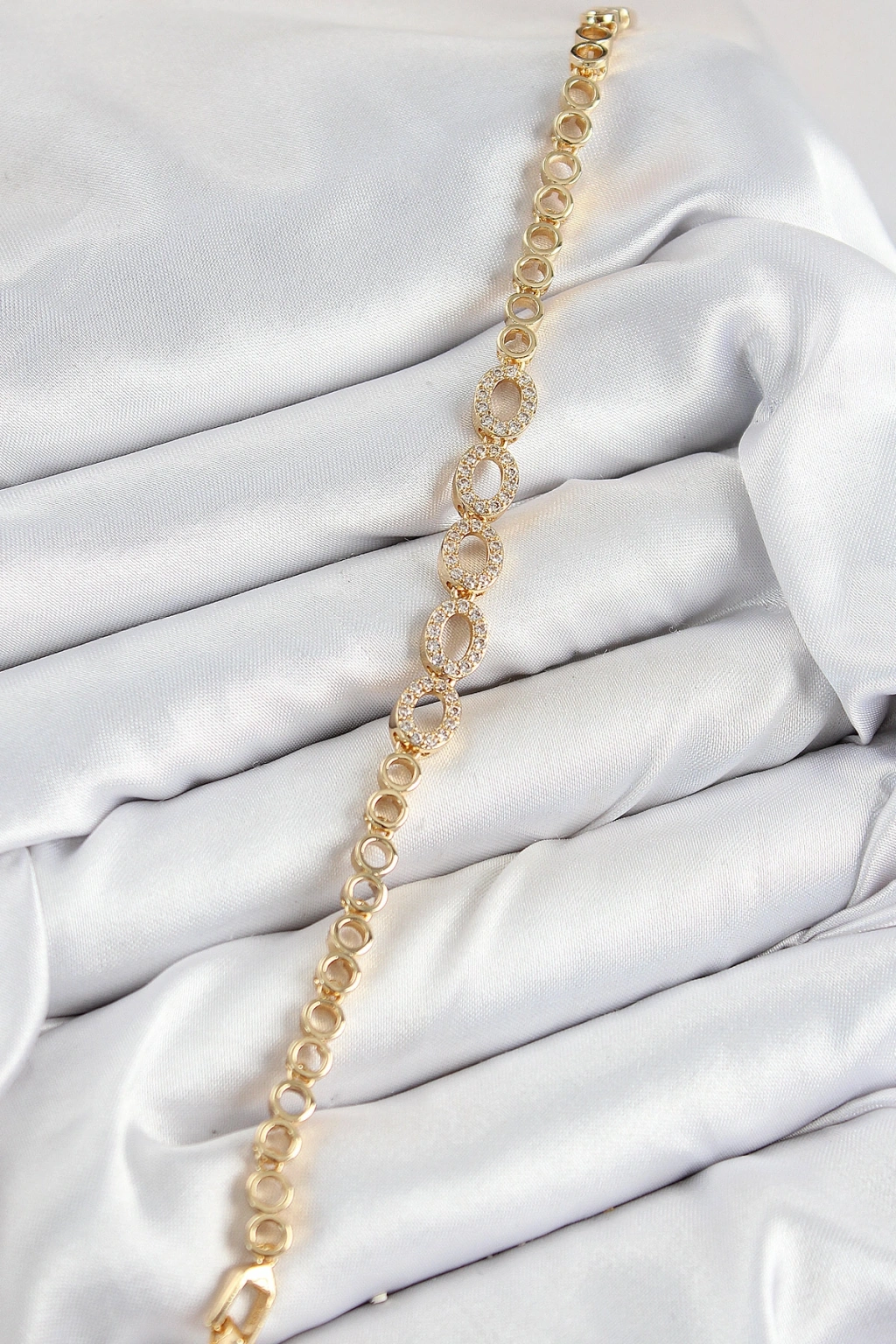 Pirinç Zirkon Taşlı Oval Model Gold Renk Kadın Bileklik - TJ-BB7543