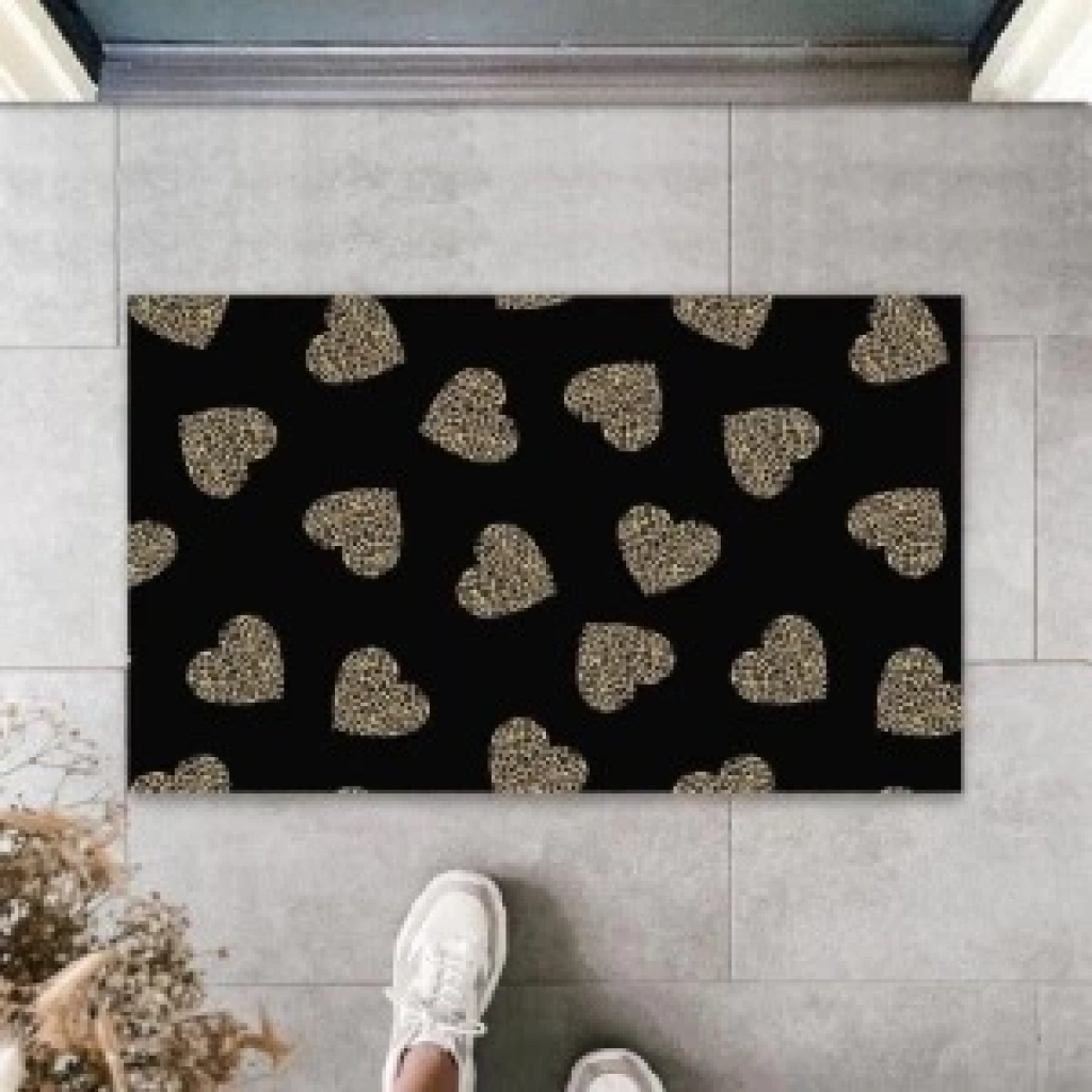 Siyah Kapı Önü Paspası Leopar Kalp Desen K-3246