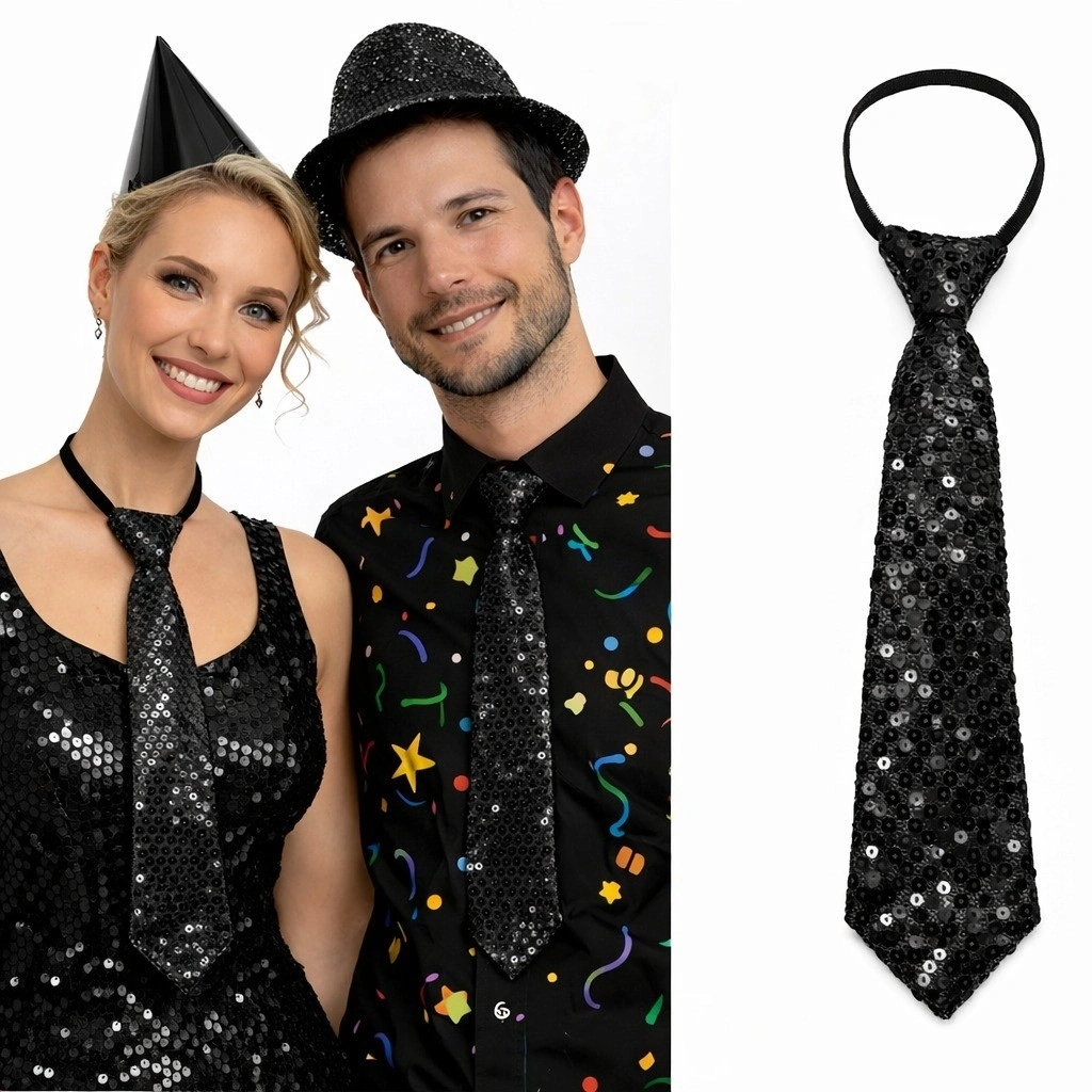 Siyah payetli fermuarlı parti kravatı; sahne performansları, doğum günü organizasyonları, yılbaşı partileri, konsept etkinlikler ve eğlence geceleri için tasarlanmıştır. Parlak payet yüzeyi ışık altında dikkat çekici bir ışıltı sağlar ve klasik siyahın asil duruşunu modern bir dokunuşla birleştirir.