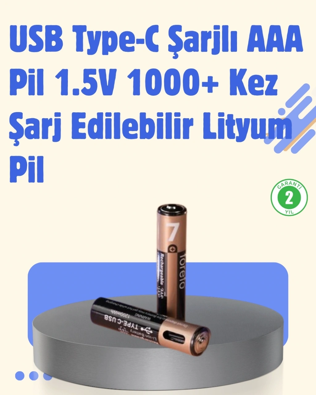 USB Type-C Şarjlı AAA Lityum Pil | 1.5V Sabit Voltaj, 1000+ Şarj Döngüsü ile Uzun Ömür