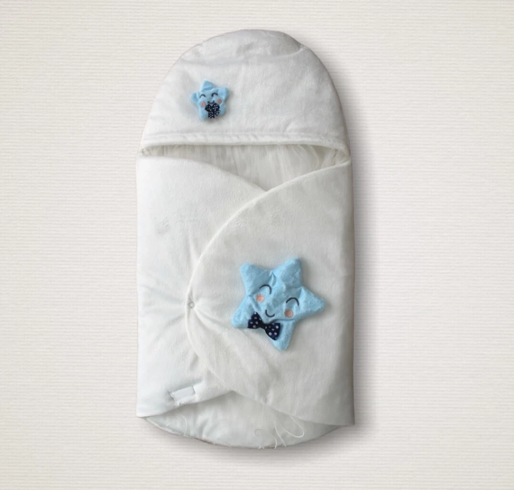 Yenidoğan Çift Yıldız Detaylı Şapkalı Duvaklı Erkek Bebek Klasik Kundak Bebek Battaniyesi
