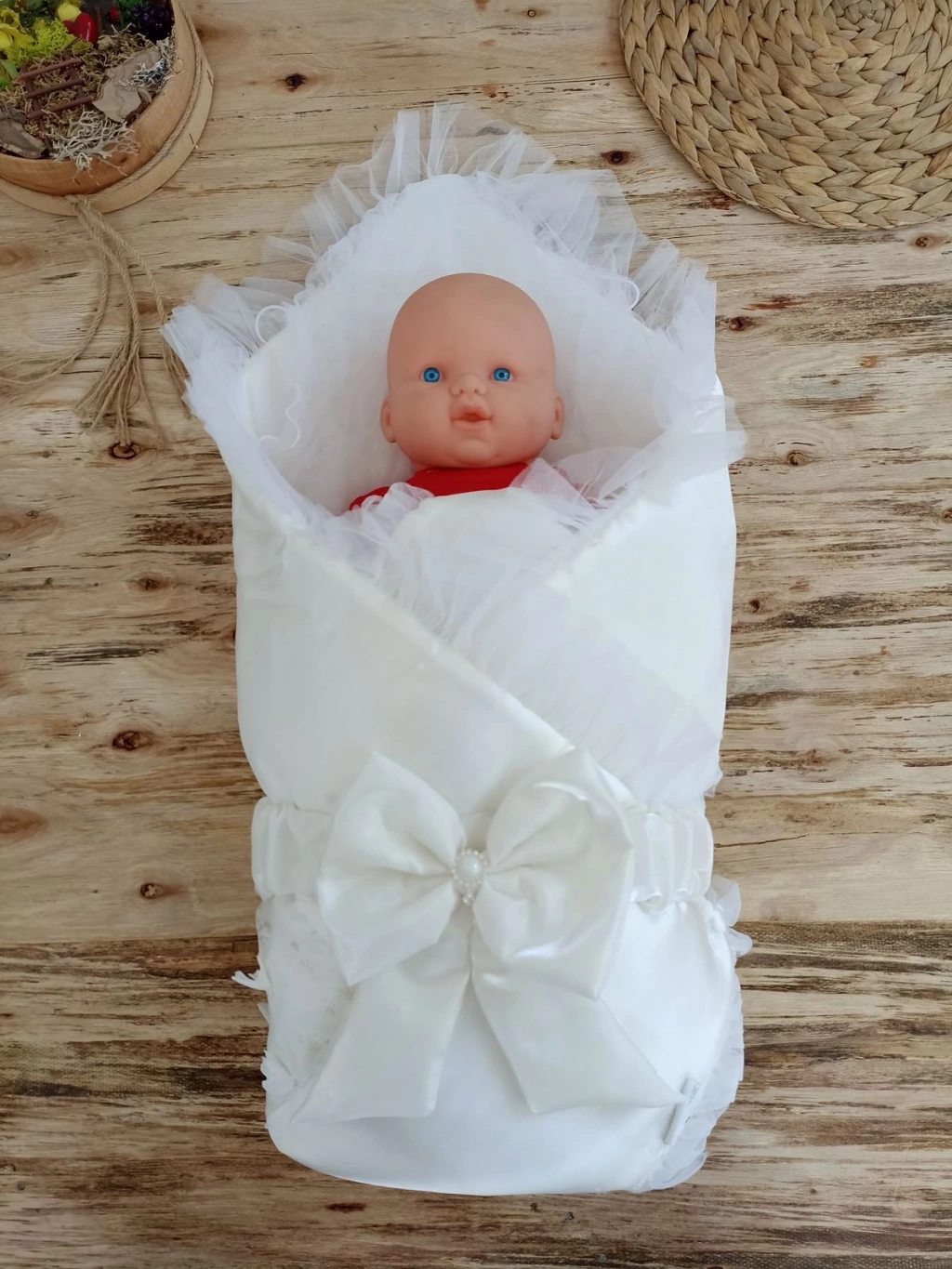 Yenidoğan İzmir İncisi Tül İşlemeli Pamuklu Fiyonklu Kundaklı Lüks 3lü Alt Açma Seti