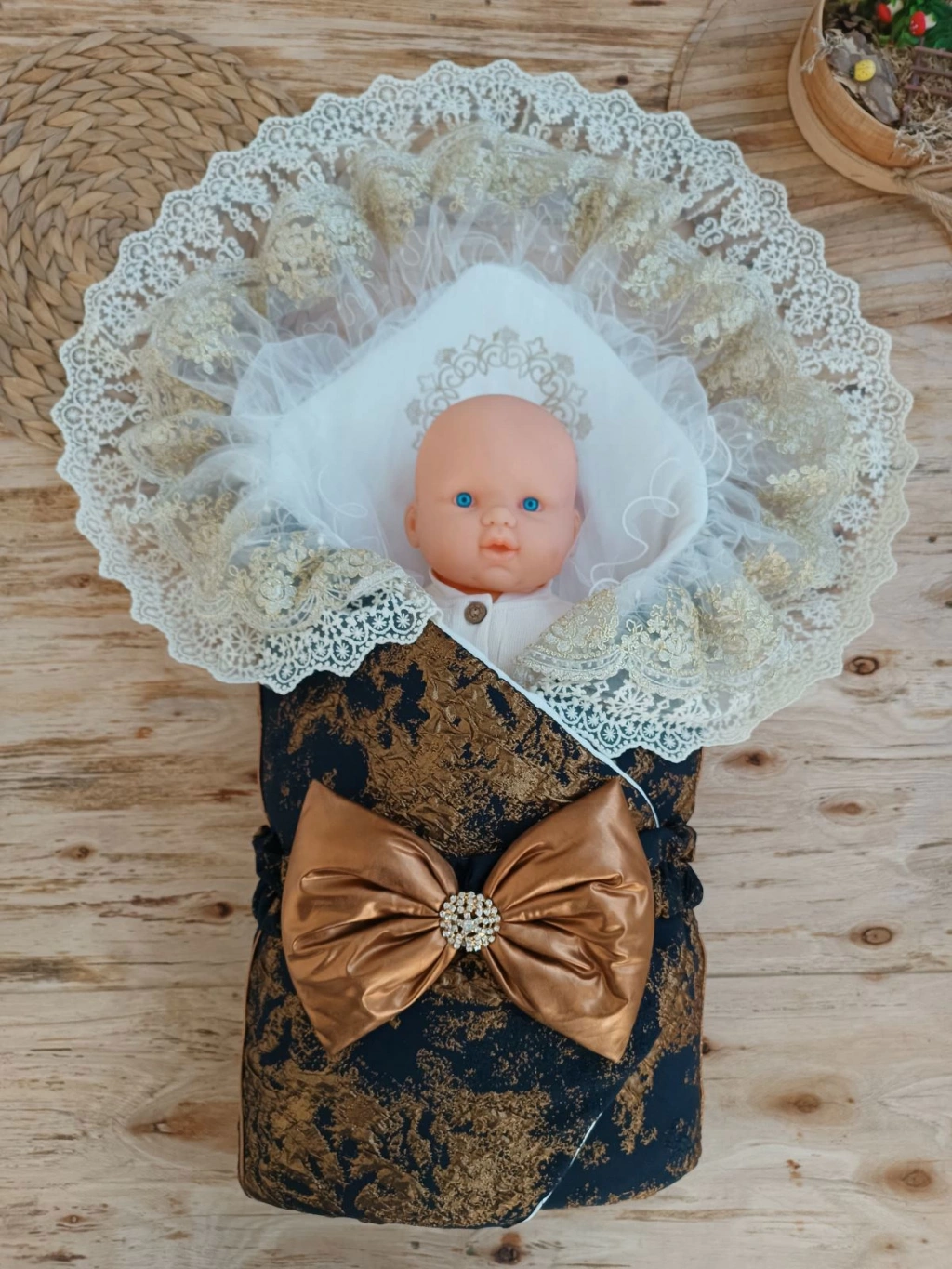 Yenidoğan Grand Lüks Kelebek Ağır Güpür İşlemeli Şapkalı Bebek Battaniyesi Kundak