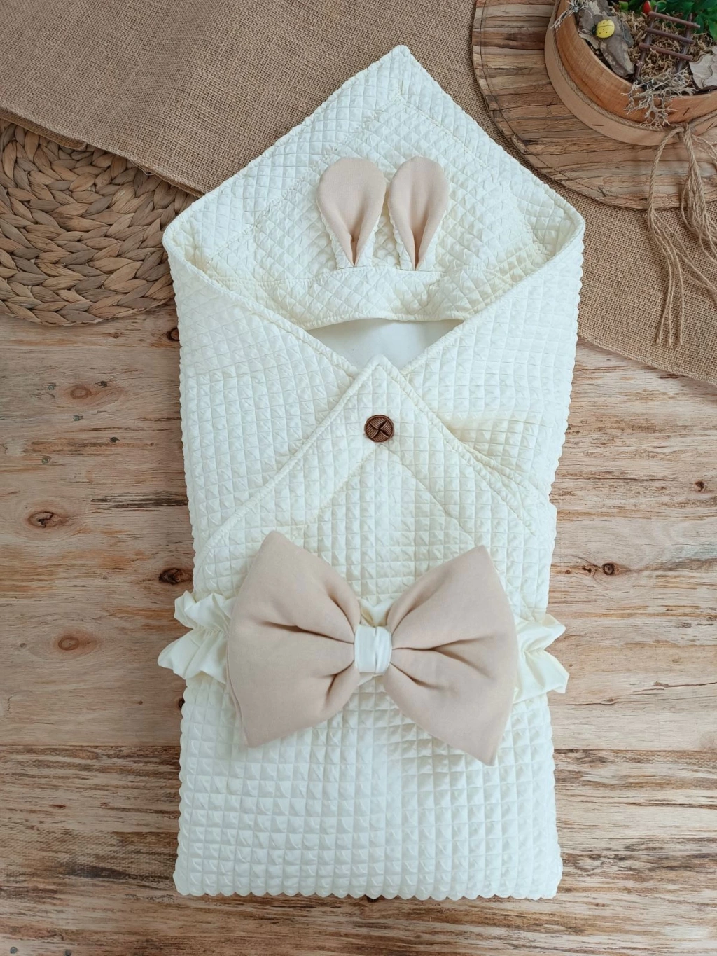 Yenidoğan Kulaklı Şapkalı Düğme Detaylı Fiyonklu Bebek Battaniyesi Kundak