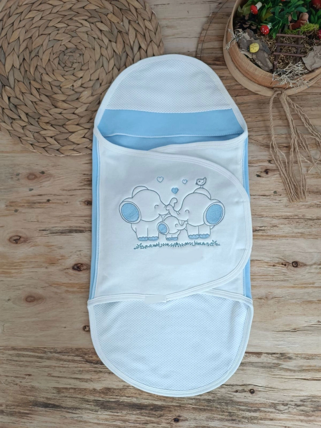 Yenidoğan Mutlu Fil Ailesi Nakışlı Çıt Çıt Kapamalı Bebek Kundak