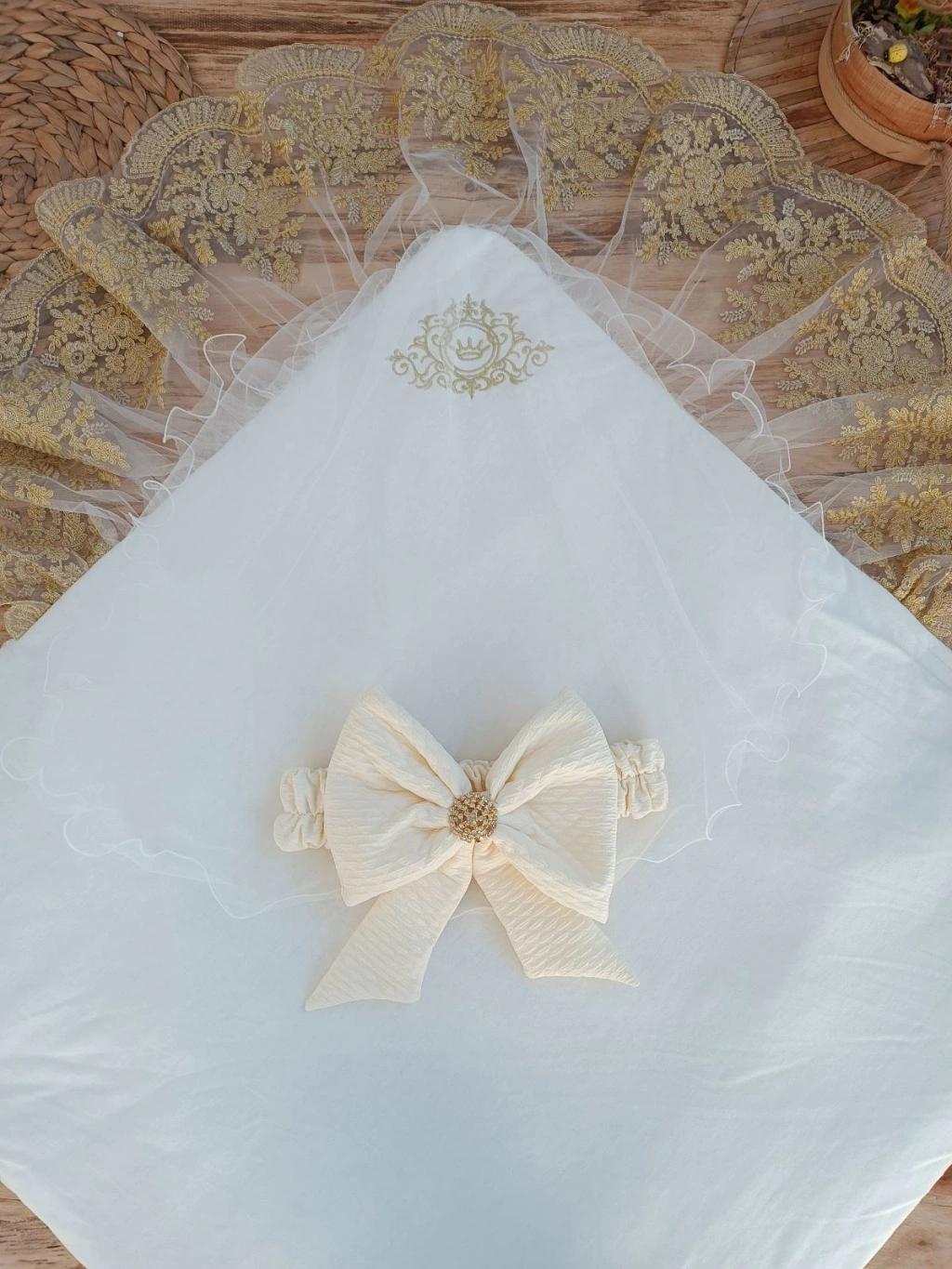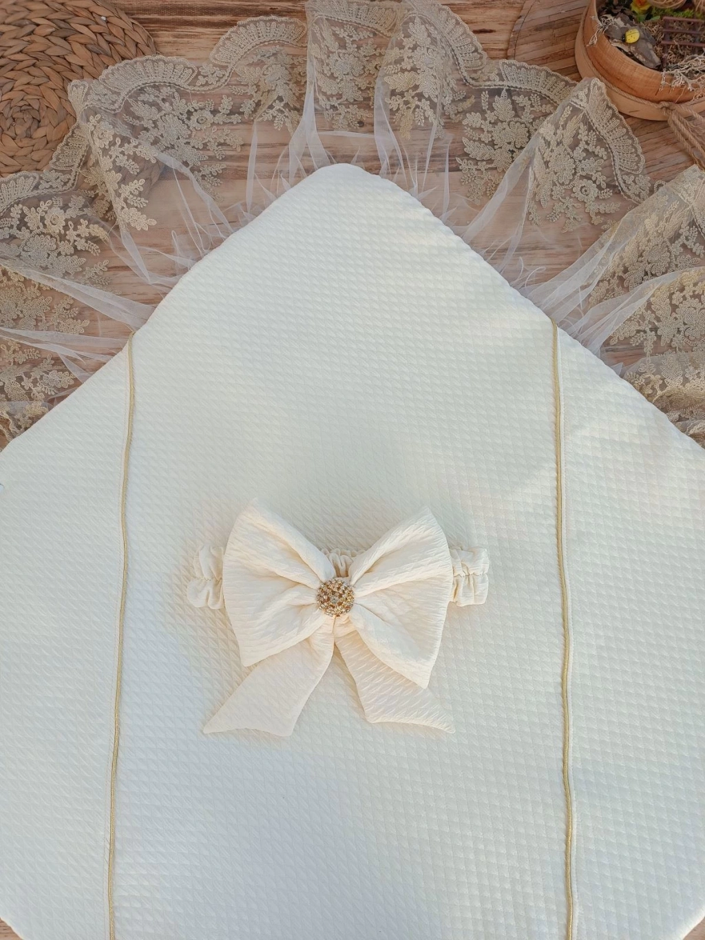 Yenidoğan Grand Lüks Kelebek Ağır Güpür İşlemeli Şapkalı Bebek Battaniyesi Kundak
