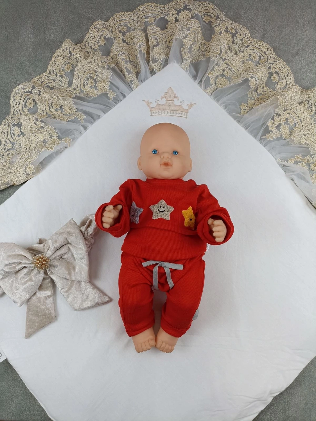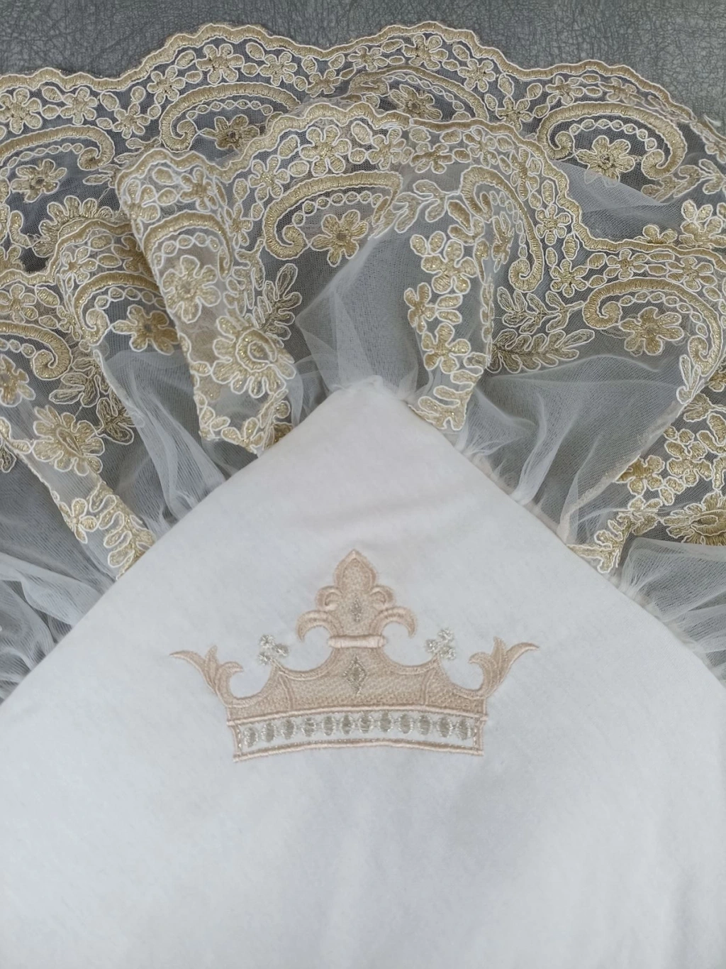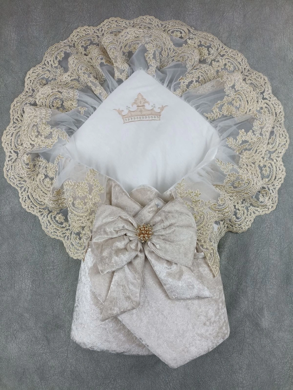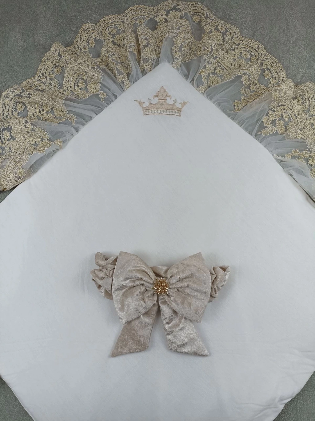 Yenidoğan Saray Kadife Taç Nakışlı İnci Fiyonklu Çift Dantel Duvak Trilüks Kundak Bebek Battaniyesi