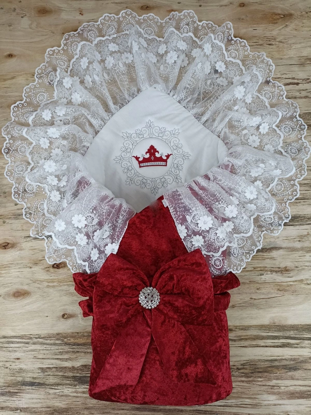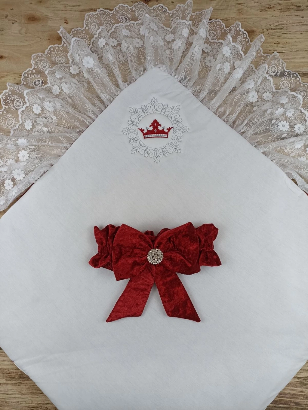 Yenidoğan Saray Kadife Taç Nakışlı İnci Fiyonklu Çift Dantel Duvak Trilüks Kundak Bebek Battaniyesi