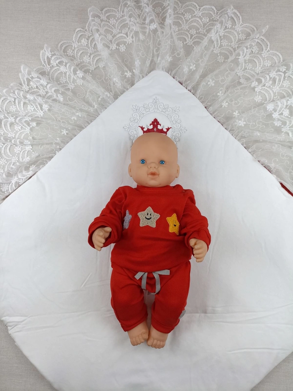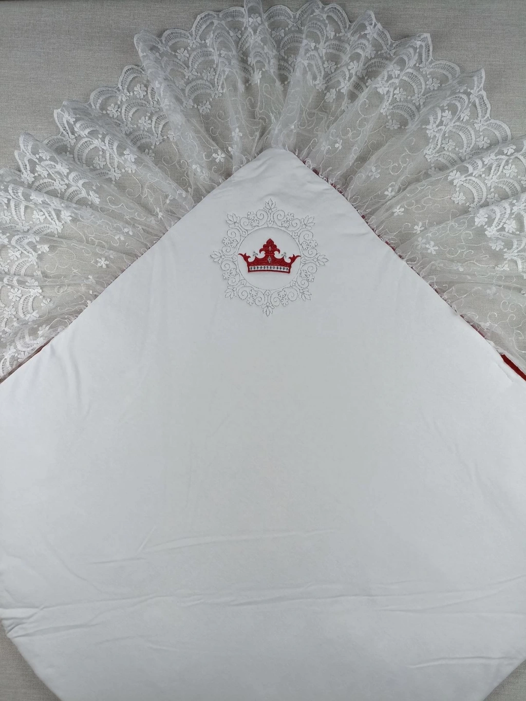 Yenidoğan Saray Kadife Taç Nakışlı İnci Fiyonklu Dantel Duvak Trilüks Kundak Bebek Battaniye
