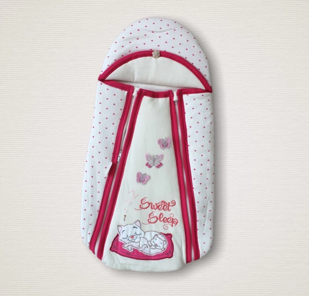 Yenidoğan Sevimli Uykucu Kedi Nakışlı Şapkalı Çift Fermuarlı Kız Bebek Kundak Bebek Battaniyesi