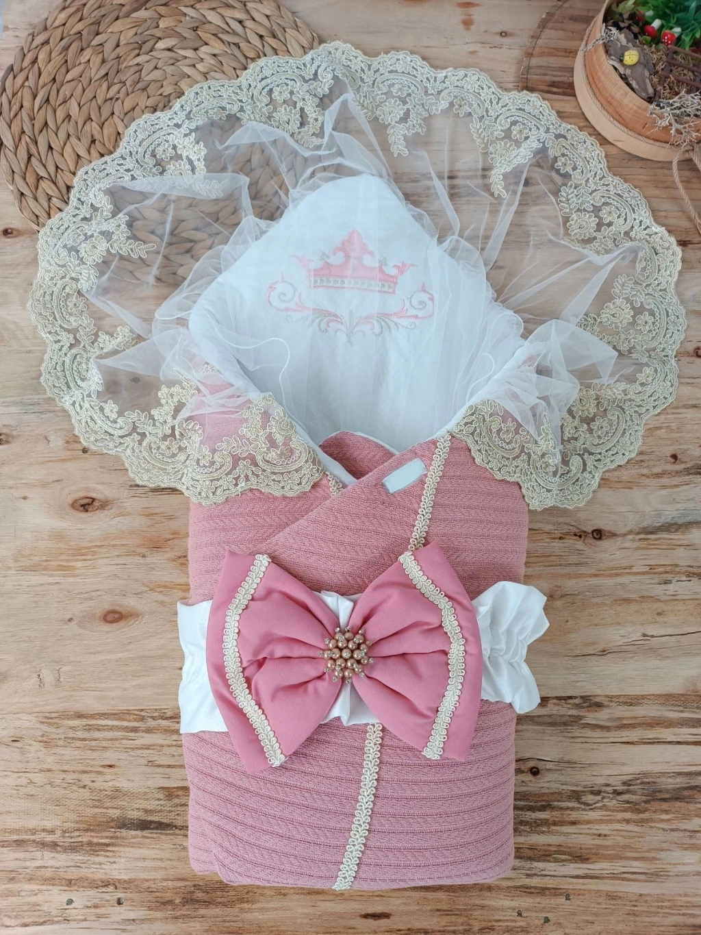 Yenidoğan Grand Lüks Kelebek Ağır Güpür İşlemeli Şapkalı Bebek Battaniyesi Kundak