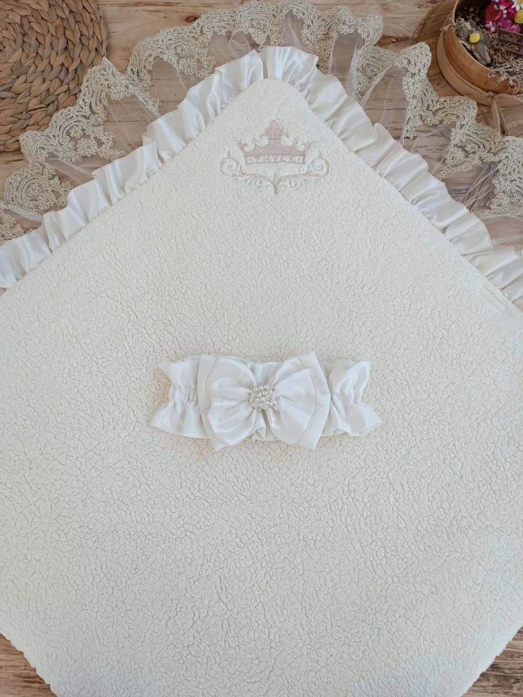 Yenidoğan Wool Yün Kumaş Taç Nakışlı Güpür Duvaklı Fiyonk Prizma Taş Unisex Kundak Bebek Battaniyesi