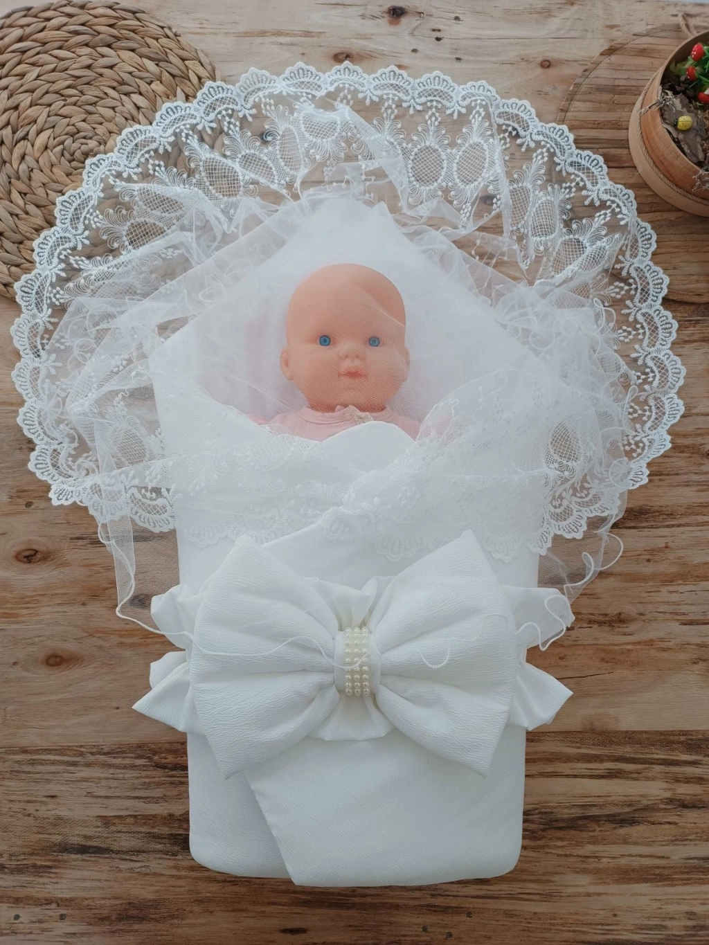 Yenidoğan Yakamoz Kumru Model Dantelli Taşlı Fiyonk Bebek Battaniyesi Kundak