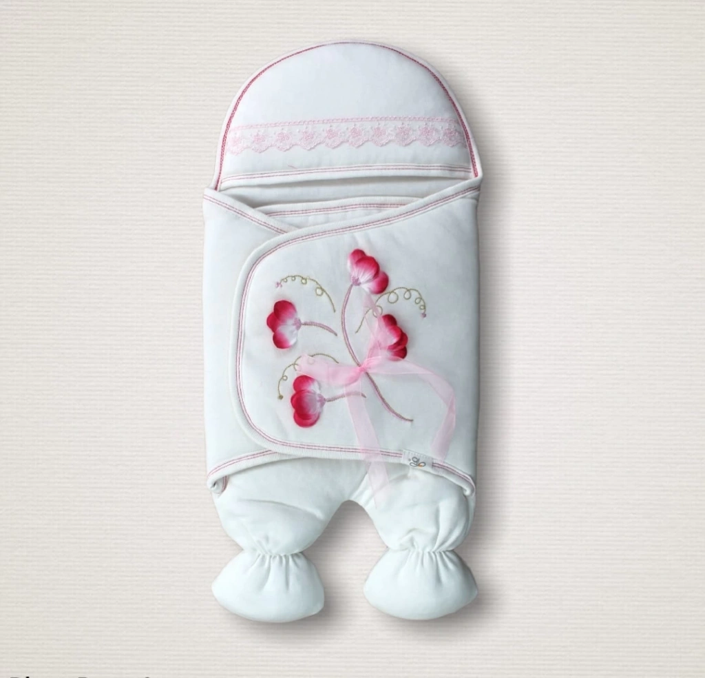 Yenidoğan Yapay Çiçek İşlemeli Şapkalı Lüks Kız Bebek Ayaklı Kundak Bebek Battaniyesi